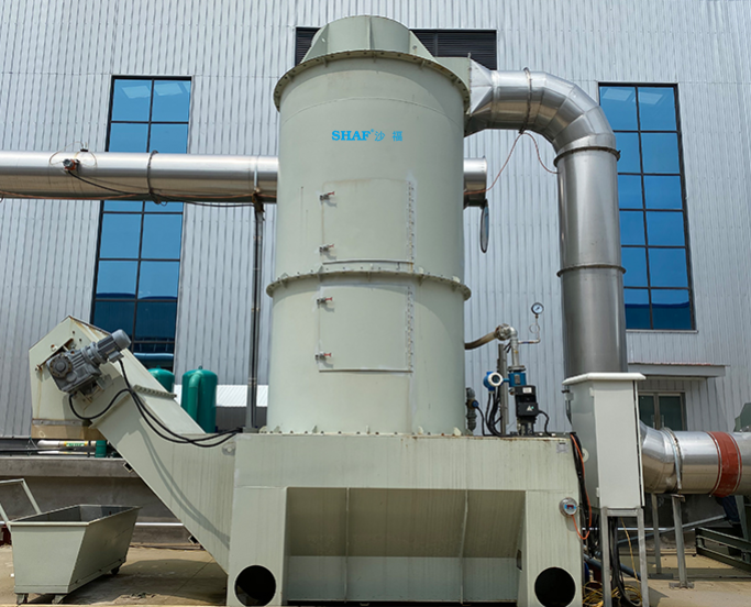 除塵系統(tǒng)運行中,收集罩把粉塵產(chǎn)生源將煙塵/粉塵捕集起來,通過管道系統(tǒng)輸送到分離器的進風(fēng)口,之后進入噴淋區(qū)域,在最近的位置通過氣